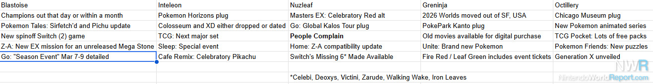 This refers to Celebi, Deoxys, Victini, Zarude, Walking Wake, and Iron Leaves. The last two introduced in Scarlet/Violet will likely be permanently available in Tera raids following the end of the current starter Pokemon reruns, while Victini and Zarude seem destined to join their mythical brethren in Z-A missions. As for Celebi and Deoxys… more on them in a bit.
